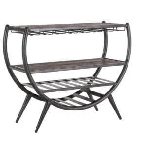 The Bowery 74″ Tall Round Bar Cabinet brings sculptural presence and practical storage to bar and hospitality settings. The rounded silhouette features rustic wooden doors on the lower cabinet and round glass doors on the upper section for a refined display.
