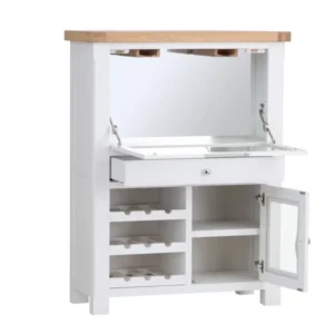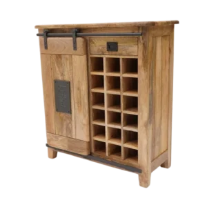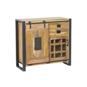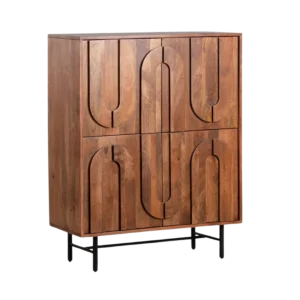 The interior includes a metal back panel with an acid washed finish that adds depth and character. A concealed drawer offers discreet storage for corkscrews and bar accessories, enhancing functionality for both residential and commercial use. Designed with durability, visual impact, the Bowery cabinet is a standout choice for trade buyers and curated retail collections.