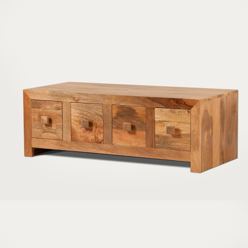 This modern and practical 8 drawer coffee table with its stylish ‘trunk’ quality acts as a wonderful storage unit as well as a convenient coffee table. It has 4 compact drawers on each side and a large surface area above. Part of Dakota Light Mango range, made entirely from solid mango fruitwood from sustainable sources and finished with a clear wax.