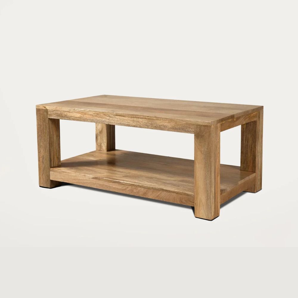 This modern chunky coffee table, available in 3 sizes, with its useful lower shelf is a stylish and practical addition to any living room.