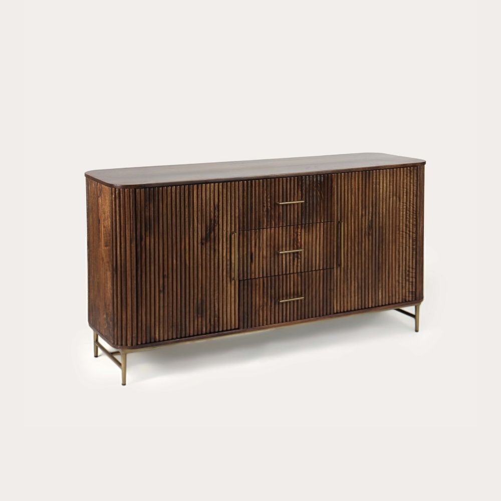 Make a statement in your dining room with the Florence Dark Mango Large Sideboard. Featuring two large cupboards with a mid-height shelf and three generous drawers down the center, this piece offers ample storage and display space for your serveware, table linens, and decor. Crafted from sustainable mango wood with a dark, rich finish, it brings a touch of Scandinavian sophistication to any interior.