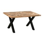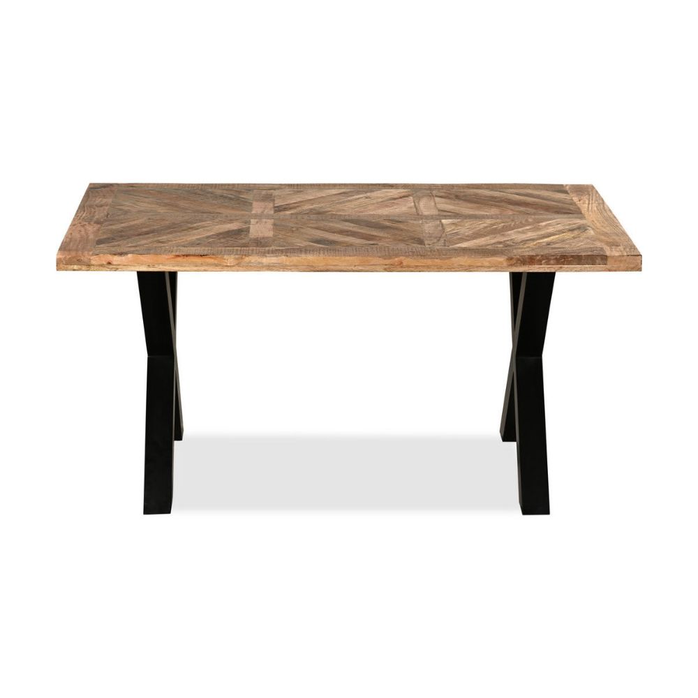 A stunning dining table from the Urban Farmhouse collection, featuring a patterned mango wood tabletop and chunky x-frame metal legs.