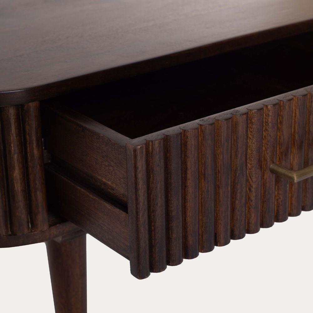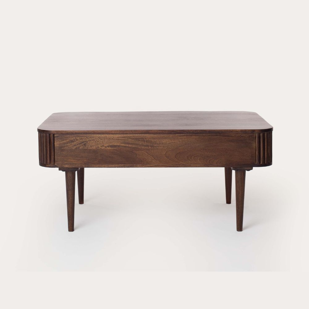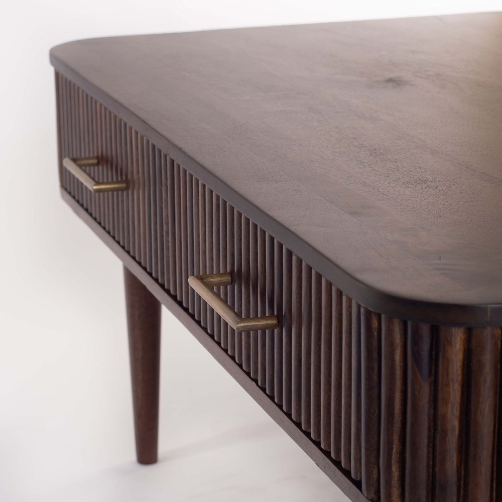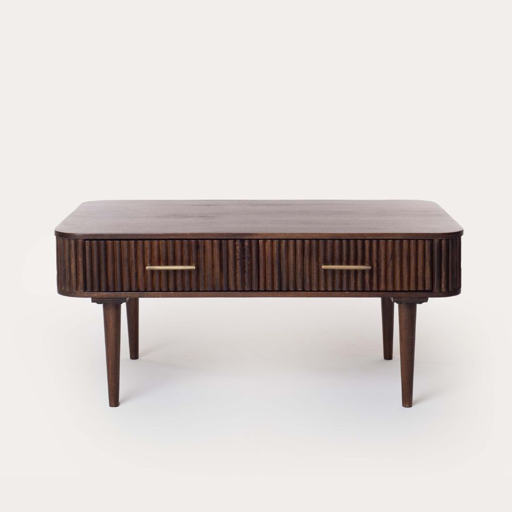 Add a dash of Scandi chic to your living room with our Florence Dark Mango 2 Drawer Coffee Table. Crafted from sustainable mango wood, this beauty boasts our signature fluted design and a modern dark mango finish. Two spacious drawers offer ample storage for your bits and bobs, while sleek gold handles add a touch of glamour. Perfect for your home!