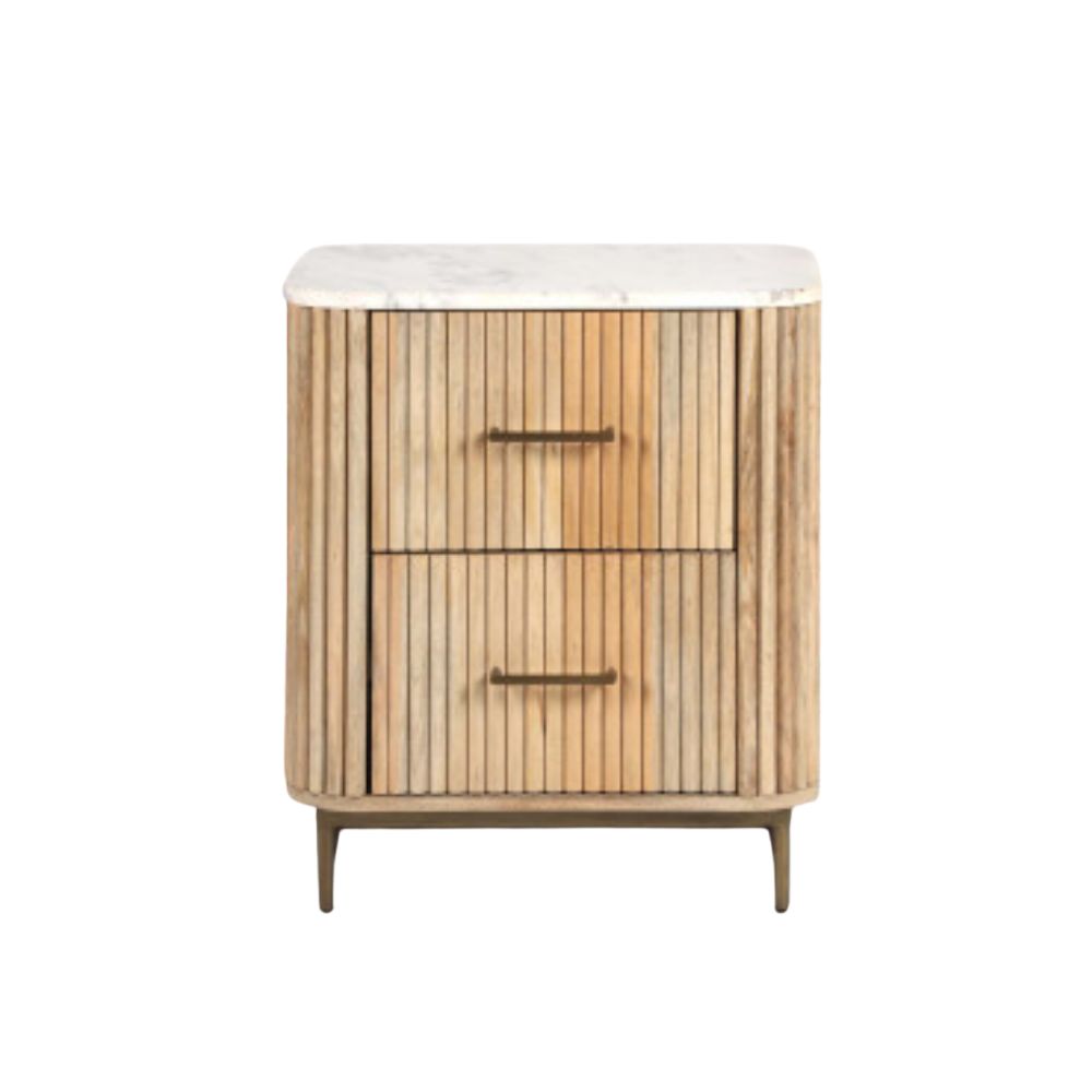 Transform your bedroom with our Florence Light Mango & Marble Bedside Table. Crafted from sustainable mango wood, it features our signature fluted design and a modern a soft pale petina. With its generous size, there’s plenty of room for your bedtime read, midnight snack, and that ‘one more episode’ remote. The gold accents add a touch of luxury to your dreams!
