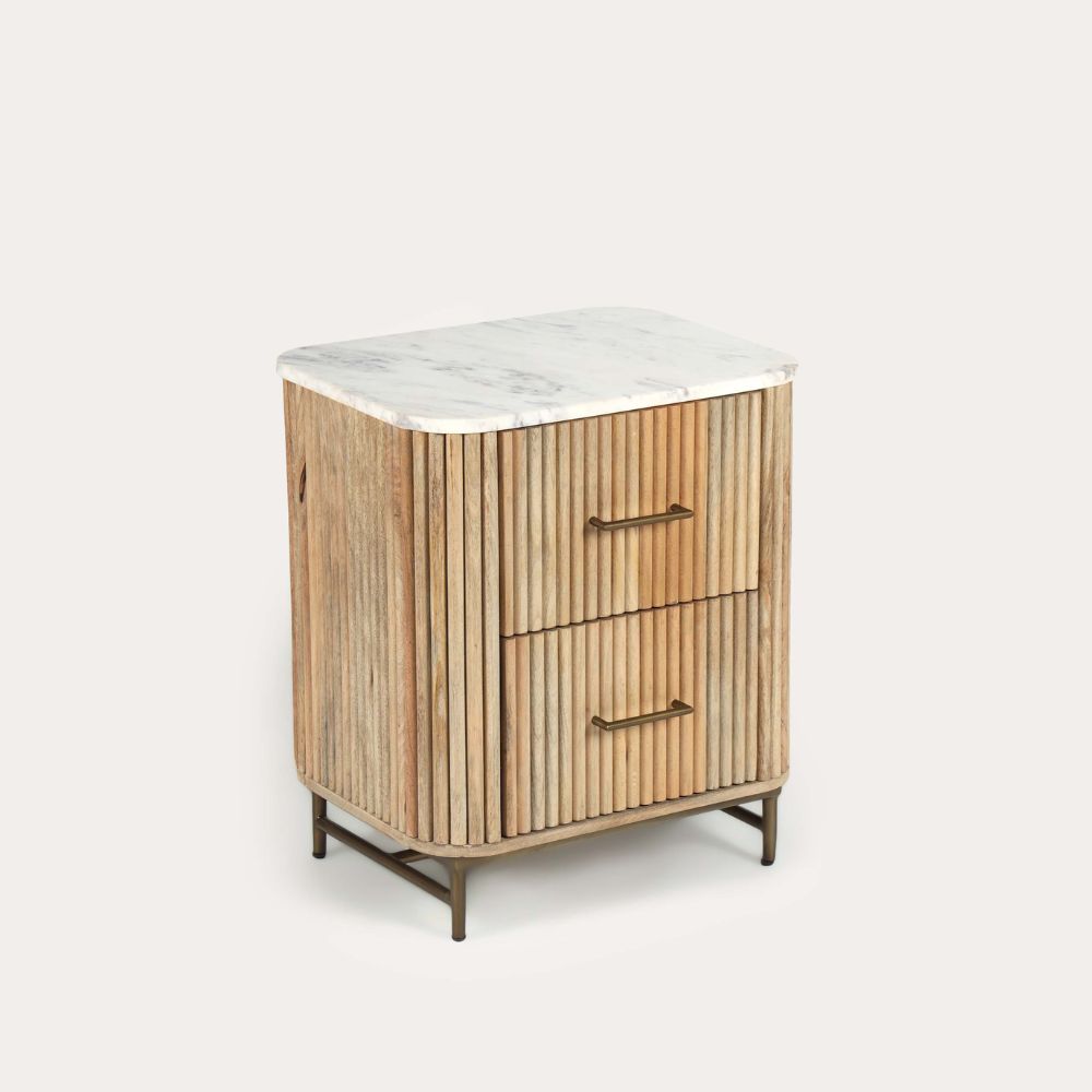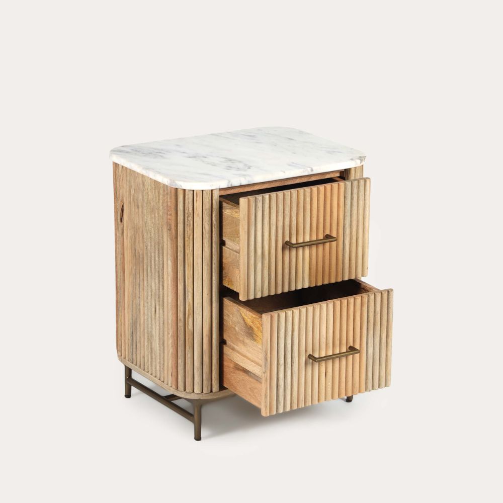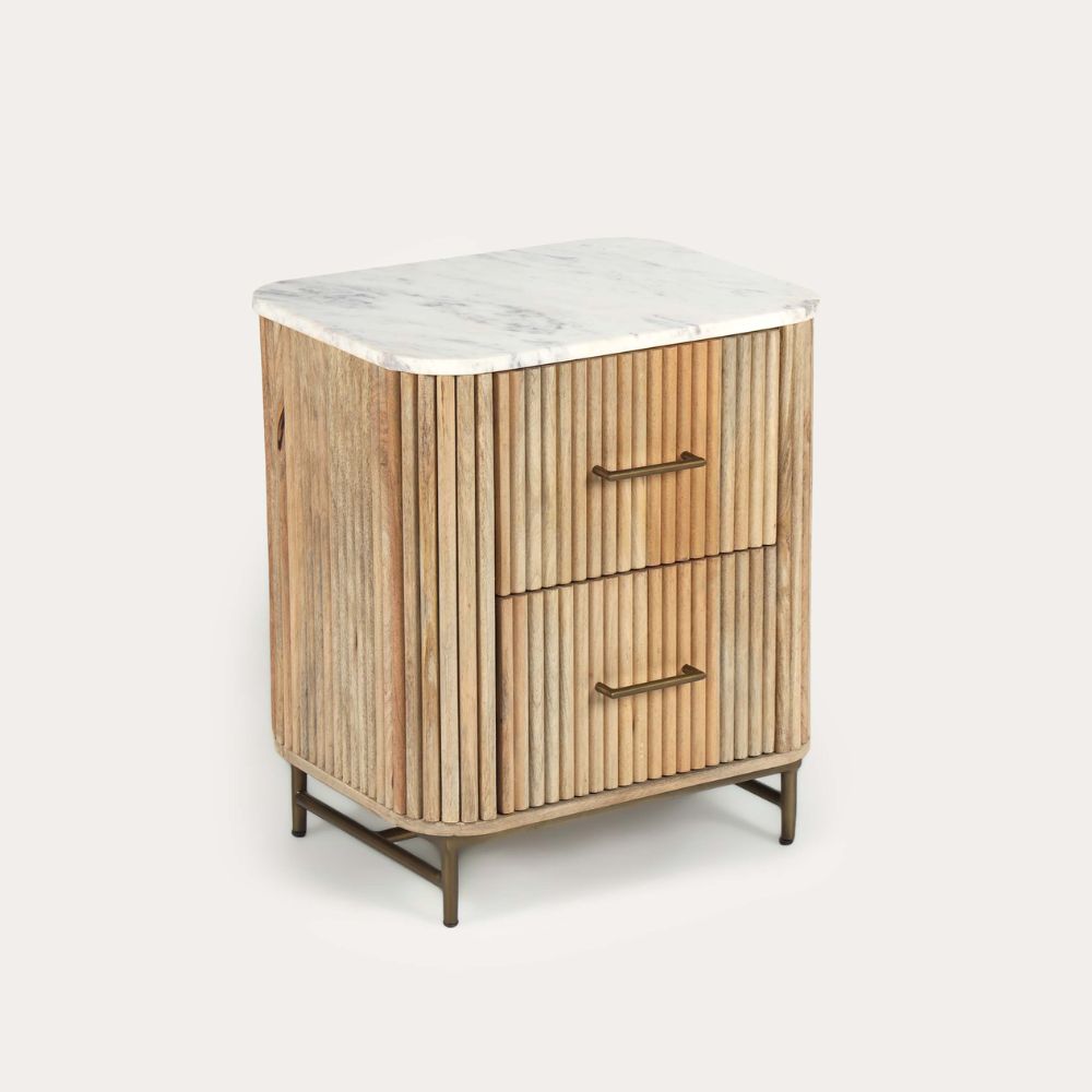 Transform your bedroom with our Florence Light Mango & Marble Bedside Table. Crafted from sustainable mango wood, it features our signature fluted design and a modern a soft pale petina. With its generous size, there’s plenty of room for your bedtime read, midnight snack, and that ‘one more episode’ remote. The gold accents add a touch of luxury to your dreams!