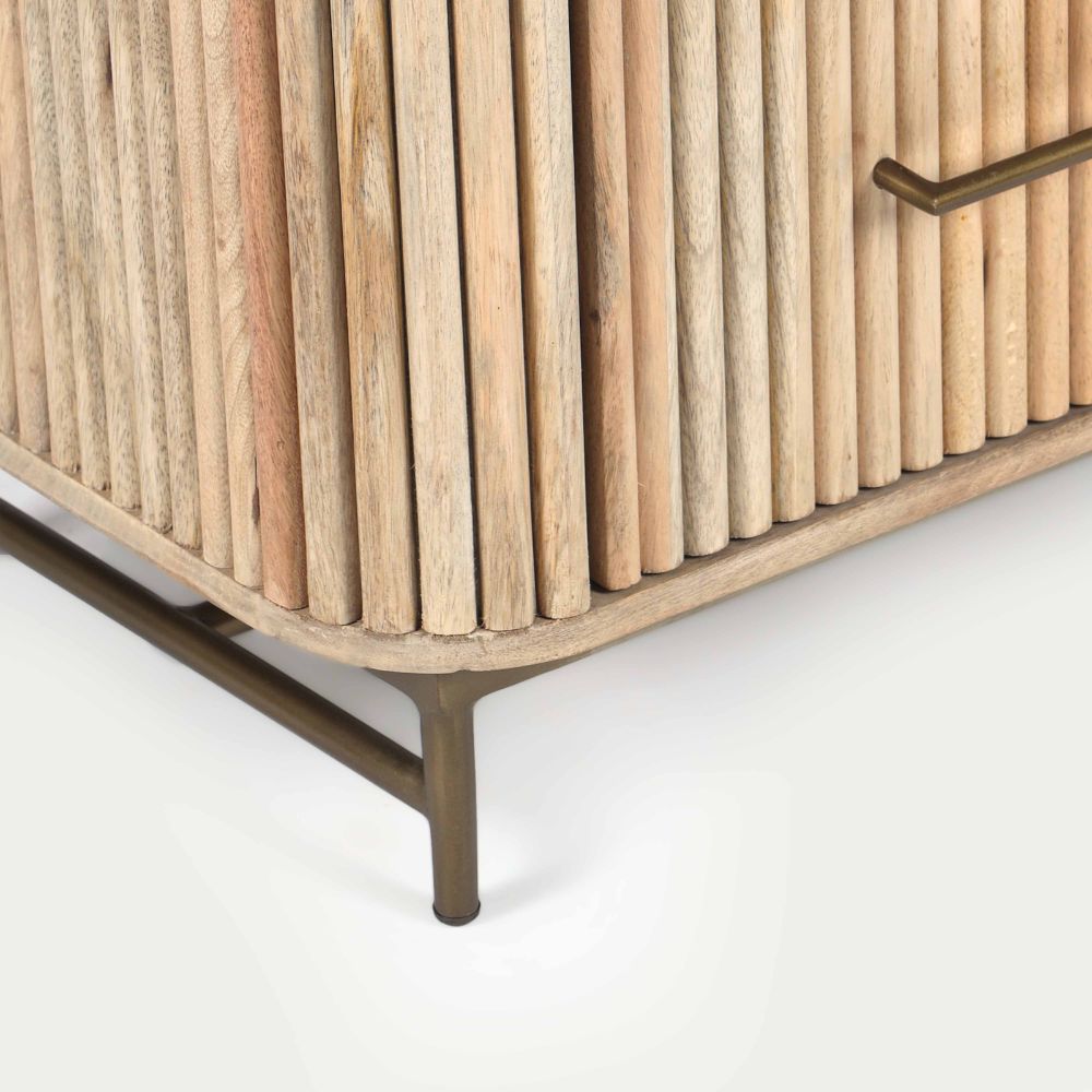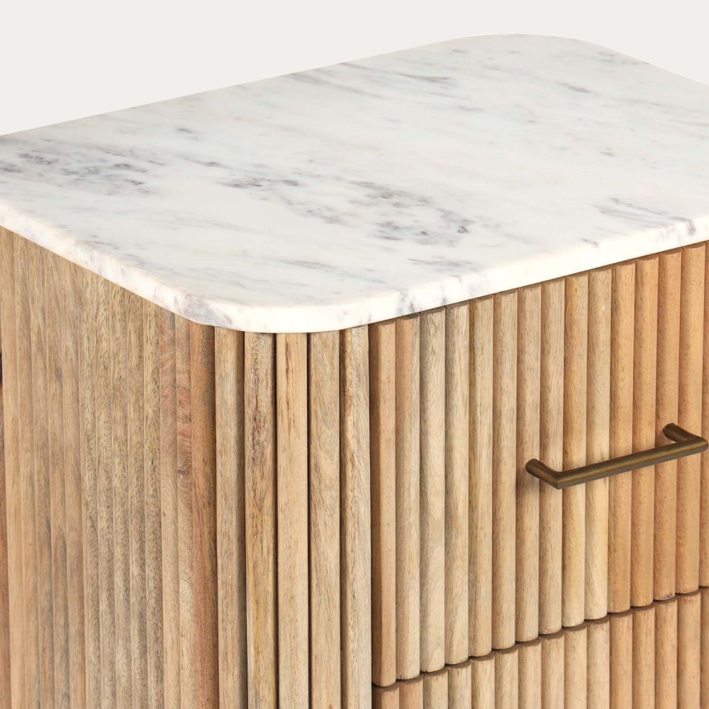 This unit is crafted from sustainable mango wood and topped with stunning Baswara White Marble, adding a touch of luxury to your home. The fluted design and gold metal accents complete its elegant appeal.
