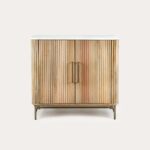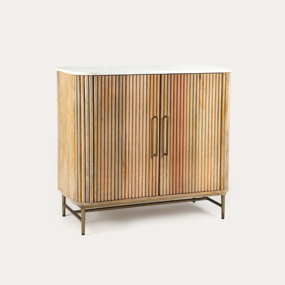New to bisque-anteater collection, this unit includes is crafted from sustainable mango wood and topped with gorgeous Baswara White Marble, this unit brings a touch of luxury to your home. The fluted design and gold metal accents are the cherries on top!