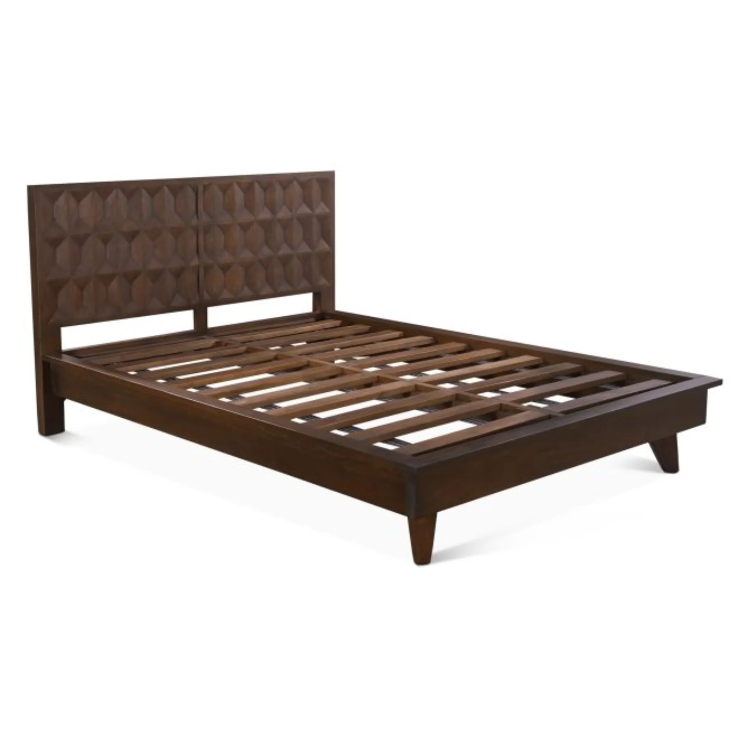 The Palermo King Bed showcases a hand-carved geometric pattern on the headboard, adding texture and artisanal detail. Finished in a rich royal brown, its solid wood construction combines durability with timeless style, making it a striking centerpiece for any bedroom.