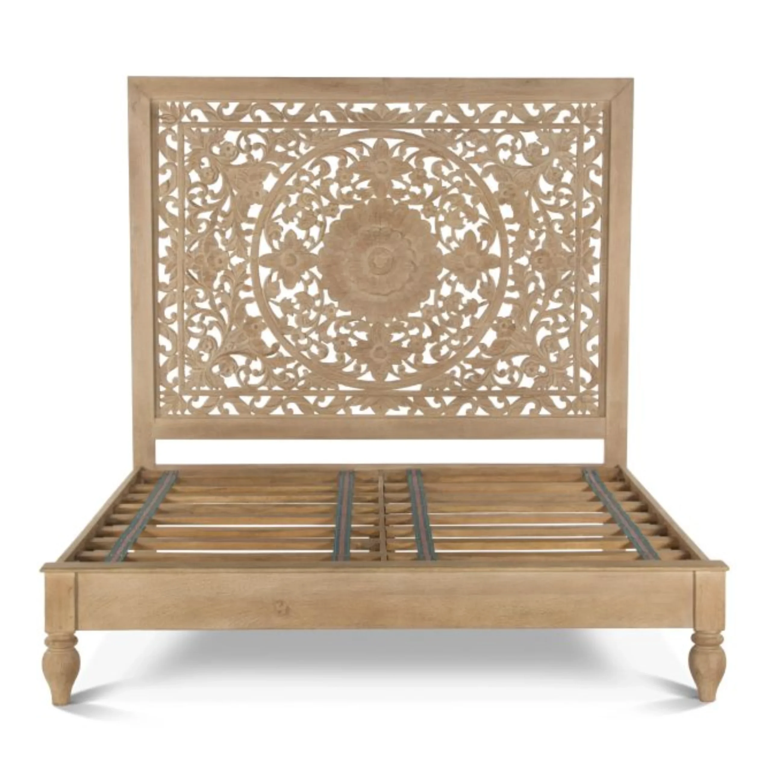 Finished in a soft whitewash that enhances the carving without obscuring the wood’s natural beauty, this bed is perfect for designers, retailers, and trade buyers seeking a refined global statement.