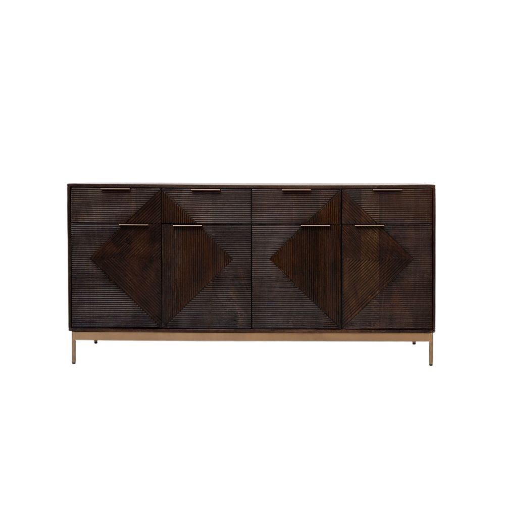 The Dahlia collection is made from 100% sustainable, solid mango wood with a warm, walnut finish. Geometric carved detailing on drawers and doors add a unique touch. Finished with discreet brass-coloured handles and legs.