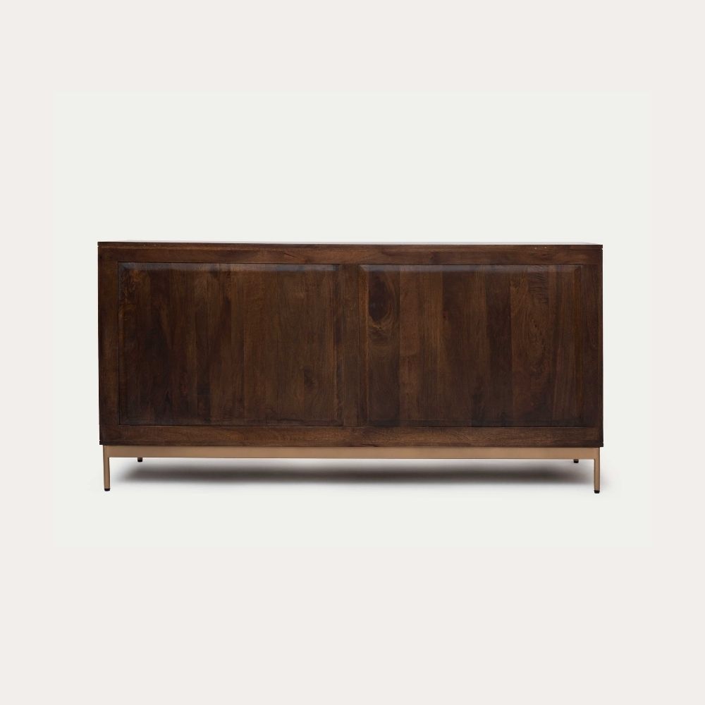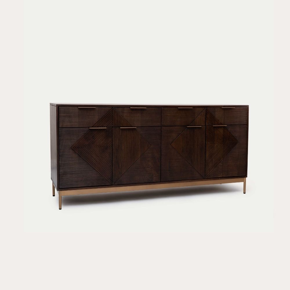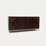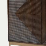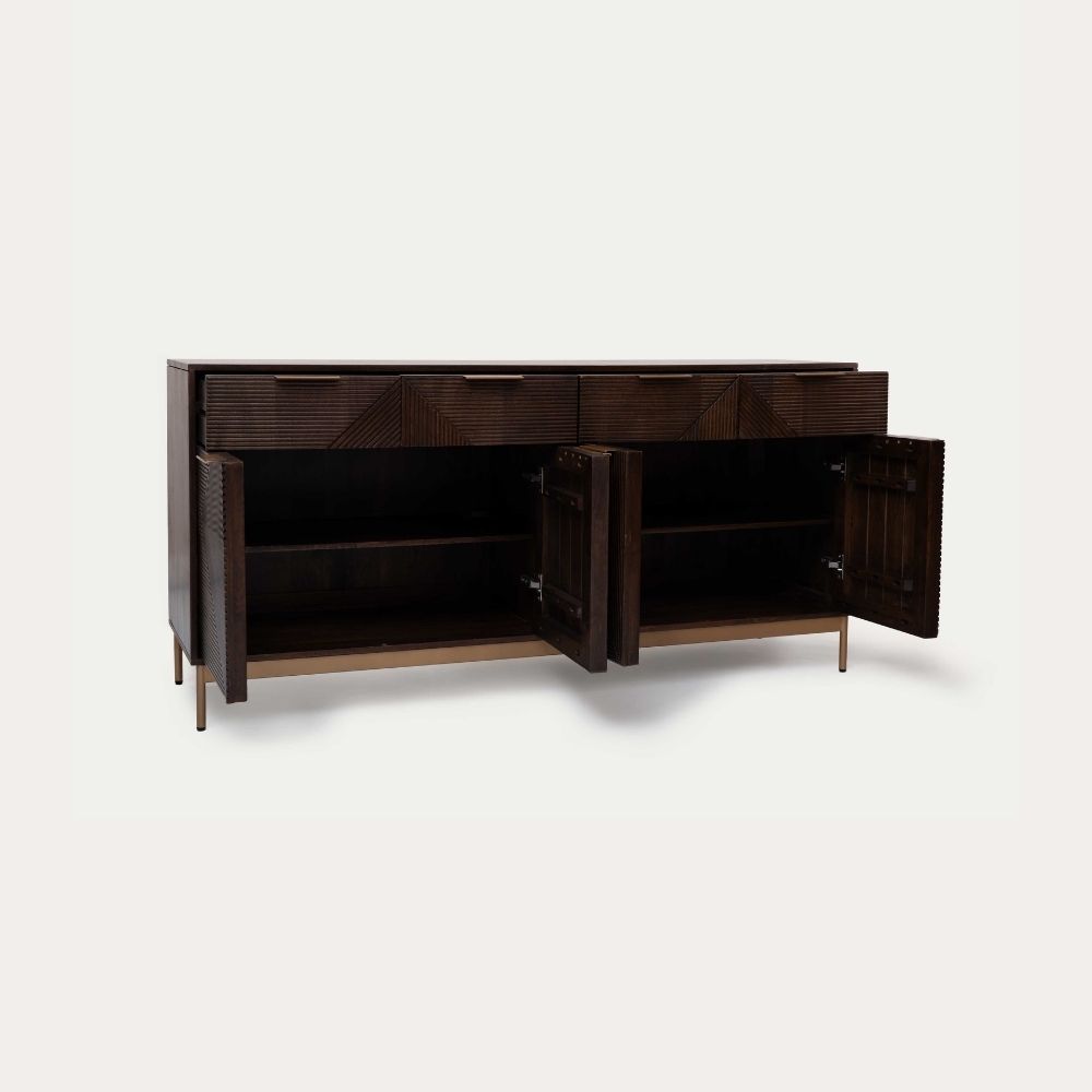 The Dahlia collection is made from 100% sustainable, solid mango wood with a warm, walnut finish. Geometric carved detailing on drawers and doors add a unique touch. Finished with discreet brass-coloured handles and legs.